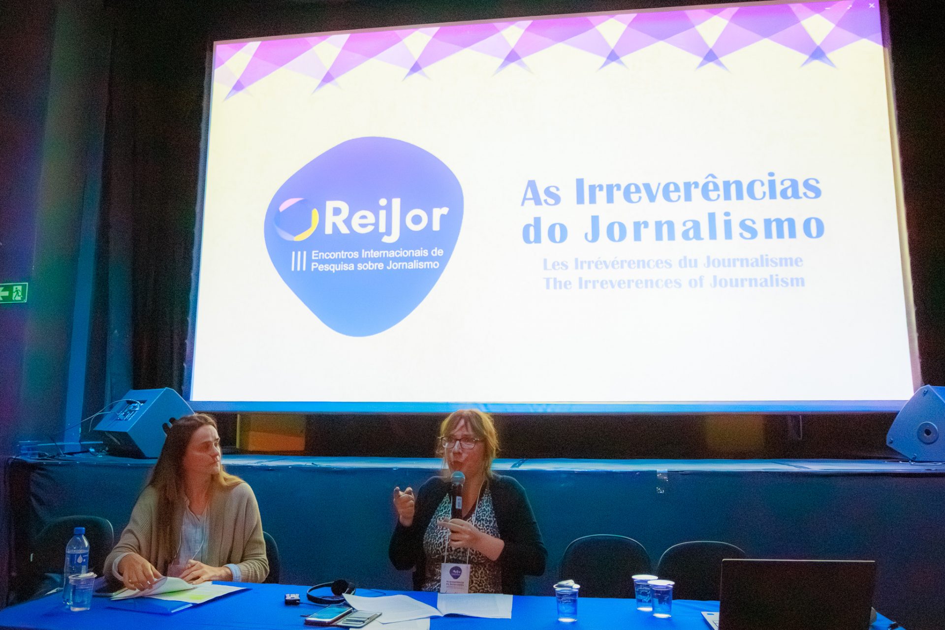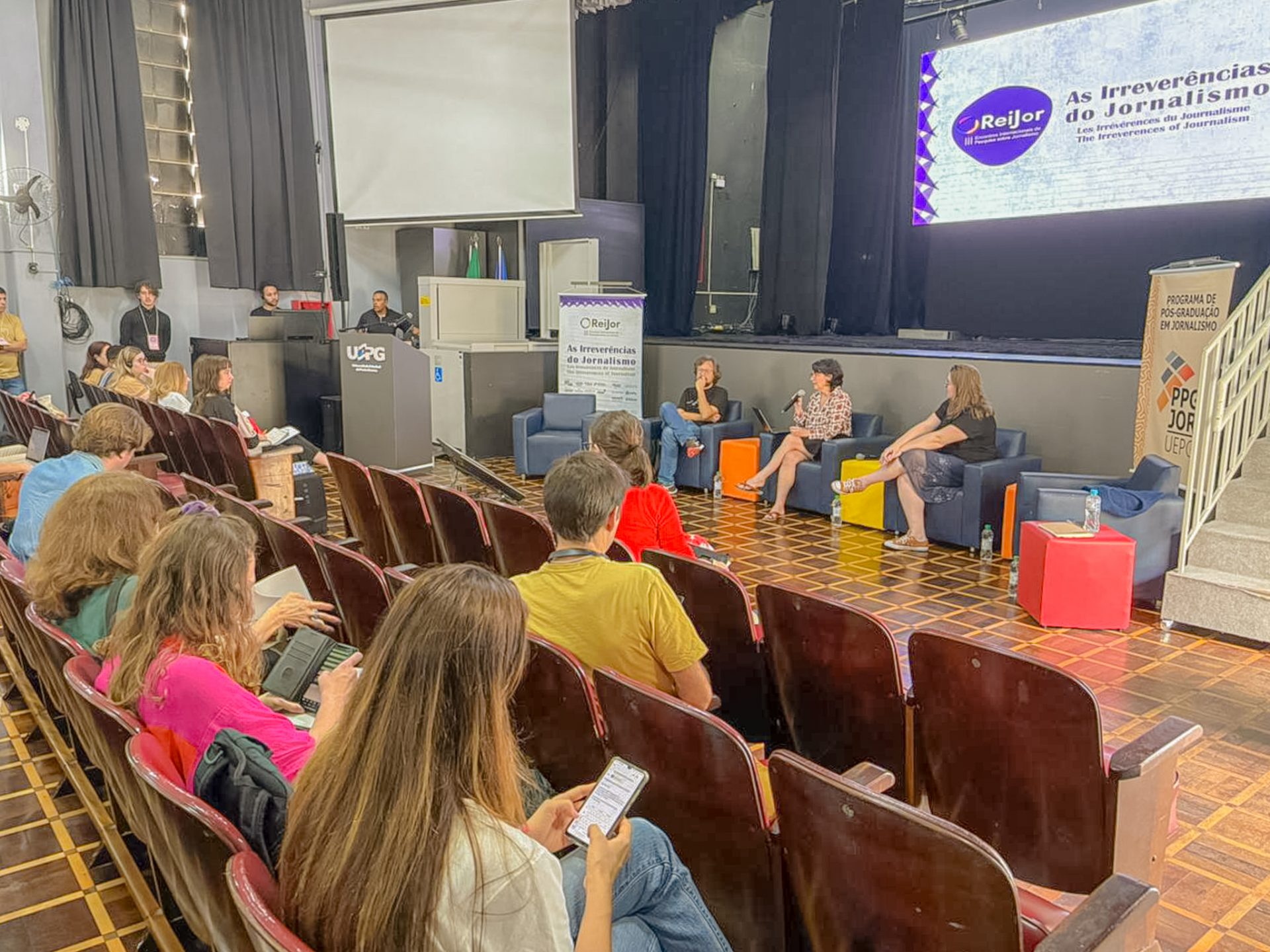 Ainda na manhã desta quarta (05), no Campus Centro, aconteceu a abertura do 15º Encontro de Jovens Pesquisadores em Jornalismo (JPJor). A primeira atividade teve como palestrantes convidadas a presidenta da Associação Brasileira de Jornalismo Investigativo (Abraji), Katia Brembatti, que também atua como editora no Estadão Verifica e como professora de Jornalismo. Além dela, participou também a diretora-executiva da Federação Nacional dos Jornalistas e do Sindicato dos Jornalistas do Paraná (Sindijor-PR), Márcia Raquel de Oliveira. As convidadas abordaram o tema “Os desafios do Jornalismo na conjuntura política e econômica do Sul Global”.