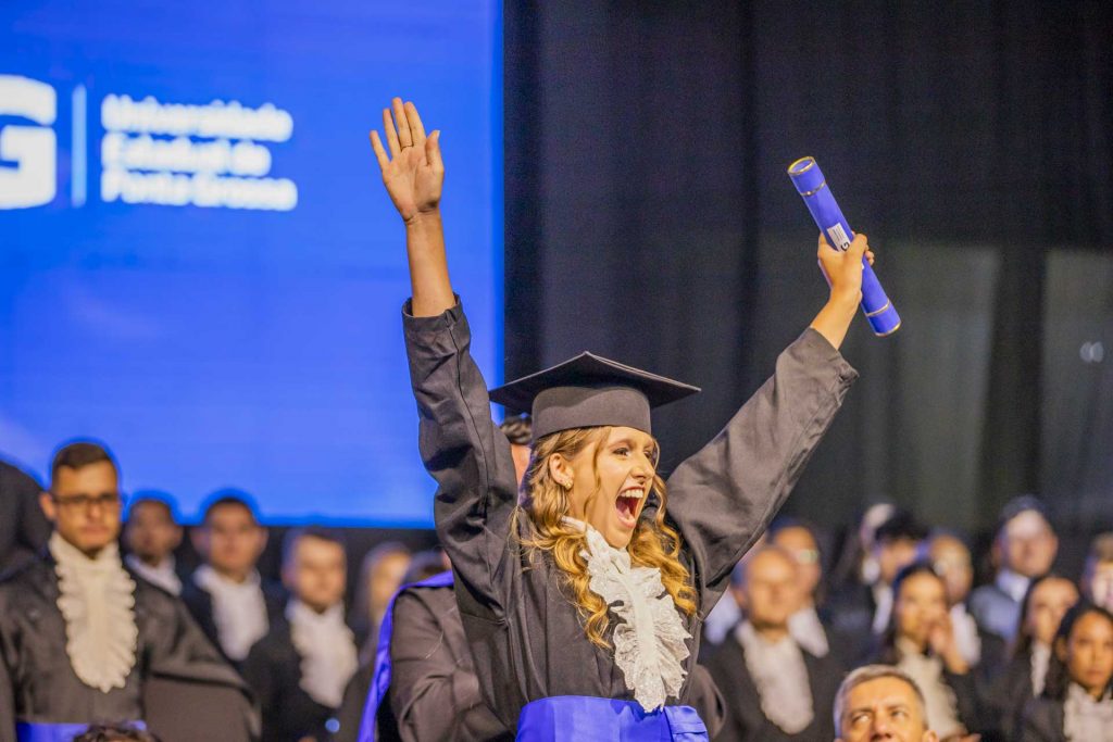 Segundo a chefe do Cerimonial da UEPG, Danielle Cristina Carneiro Dykstra, a colação é o ato obrigatório e oficial pelo qual os concluintes dos cursos superiores de graduação recebem a imposição de grau, realizada em conjunto com a Pró-Reitoria de Graduação (Prograd), com apoio de empresas especializadas contratadas por licitação. “É a garantia da outorga de grau em uma bela cerimônia, de forma inteiramente gratuita ao acadêmico: desde o empréstimo de becas e faixas nas cores de seu curso, o canudo, o convite a seus amigos e familiares e todas as fotos, realizadas com profissionais e distribuídas de maneira gratuita”, destaca. Segundo ela, as formaturas são marcadas pela ansiedade e mistura de sentimentos por cada nome chamado, por cada láurea entregue e por cada noite concluída com sucesso. “O que ficam são as fotos, as imagens tiradas em alta qualidade por profissionais, tratadas individualmente e entregues como uma última lembrança dos anos vividos na UEPG”, afirma. Para ela, os registros funcionam como um “até breve” entre a Universidade e seus egressos, com a esperança de que eles retornem em cursos de pós-graduação, mestrado ou doutorado.