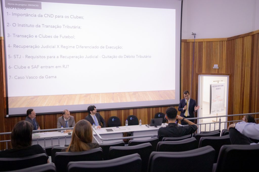 A primeira fala foi do advogado Maciel. Ele abordou o instituto da recuperação judicial, a transição tributária e também as Sociedades Anônimas de Futebol (SAF). “Expliquei que quando uma empresa está em recuperação judicial ela reduz a capacidade de pagamento para a Receita Federal e isso gera melhores benefícios fiscais para as transações tributárias. Falamos também sobre como essa Lei se aplicaria aos clubes de futebol e como eles poderiam ter acesso a recuperação a partir das SAFs”, afirma.
