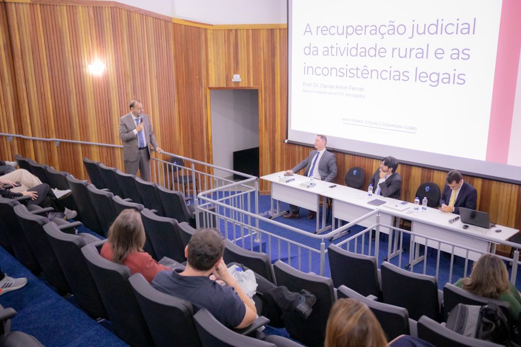 Na sequência, o professor Daniel Amin destacou a recuperação judicial da atividade rural e suas inconsistências legais. Segundo ele, atualmente existe um problema legal no Direito brasileiro gerado, principalmente, pelas modificações da legislação ao longo do tempo. “O artigo primeiro da lei de falência e recuperação judicial determina que esse regime jurídico se aplica exclusivamente aos empresários. O artigo 971 do Código Civil Brasileiro determina que a atividade agropecuária não é empresária, a não ser que ela seja promova o registro próprio. E o artigo 48, parágrafo segundo, da Lei 14.112, permite a recuperação judicial do produtor rural individual, mesmo sem registro. Então estamos vivendo um conflito quanto à matéria, ou seja, cada um está regulando de um jeito e os tribunais terão que dizer o que será feito para solucionar esse problema”, destaca.