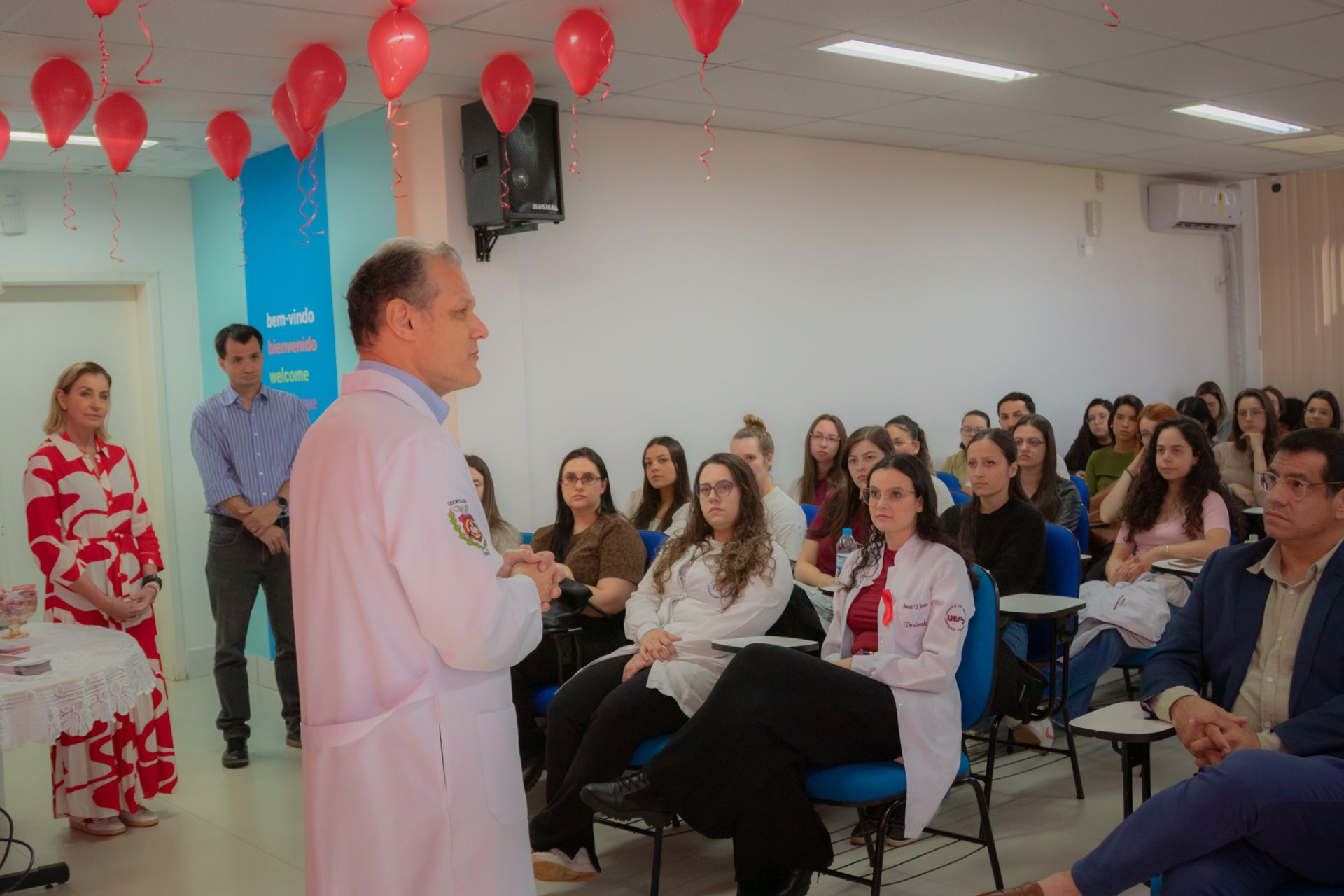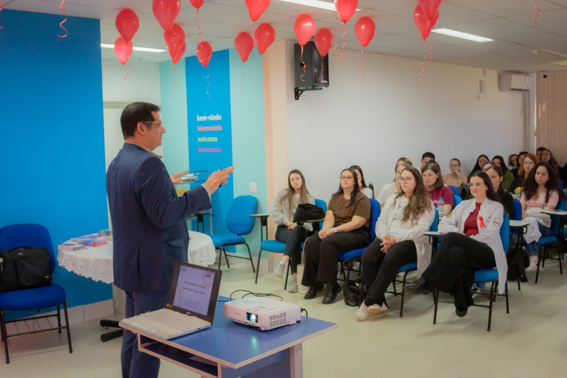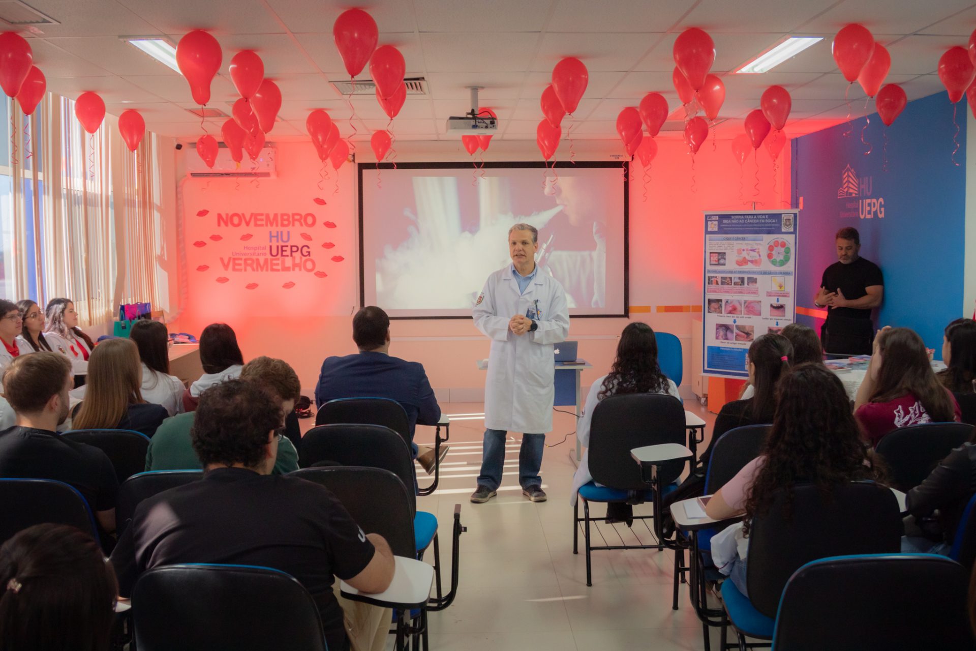 Participaram das atividades cerca de 80 pessoas, entre residentes multiprofissionais dos HUs, acadêmicos de odontologia da UEPG e da Unicesumar. “Esse evento do Novembro Vermelho foi voltado para a parte multiprofissional, justamente para que a gente consiga colocar na cabeça de cada uma das pessoas que participou aqui que o diagnóstico precoce é função do profissional de saúde”, explica a preceptora Maria Luiza Chemim. “Todo mundo está apto a fazer um exame inicial da cavidade oral, talvez identificar alguns fatores iniciais e fazer com que esse paciente seja diagnosticado de forma precoce, tratado e tenha um desfecho o mais favorável possível”.