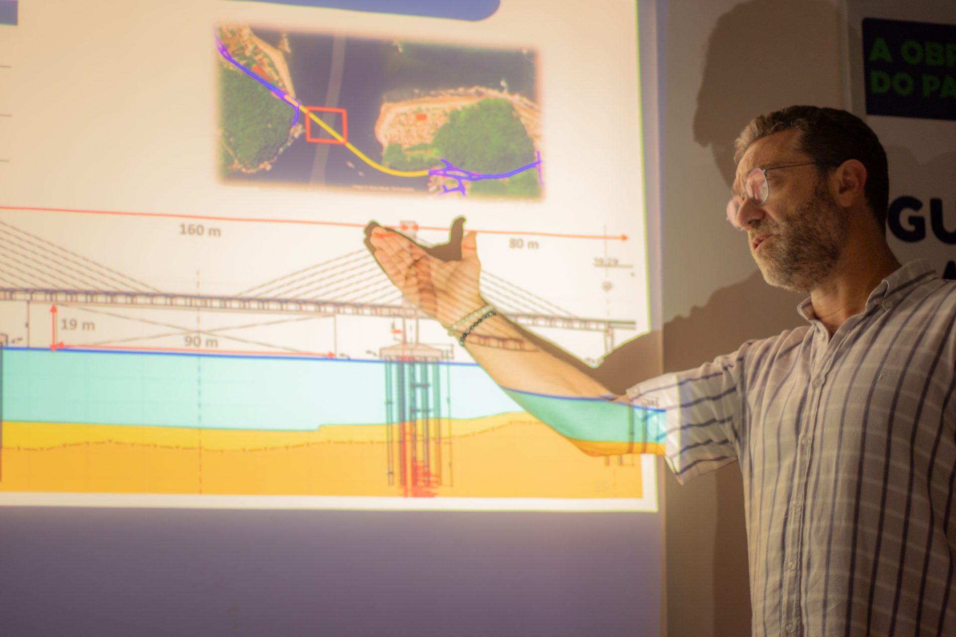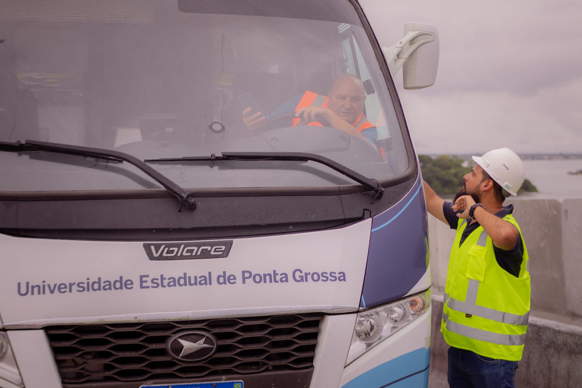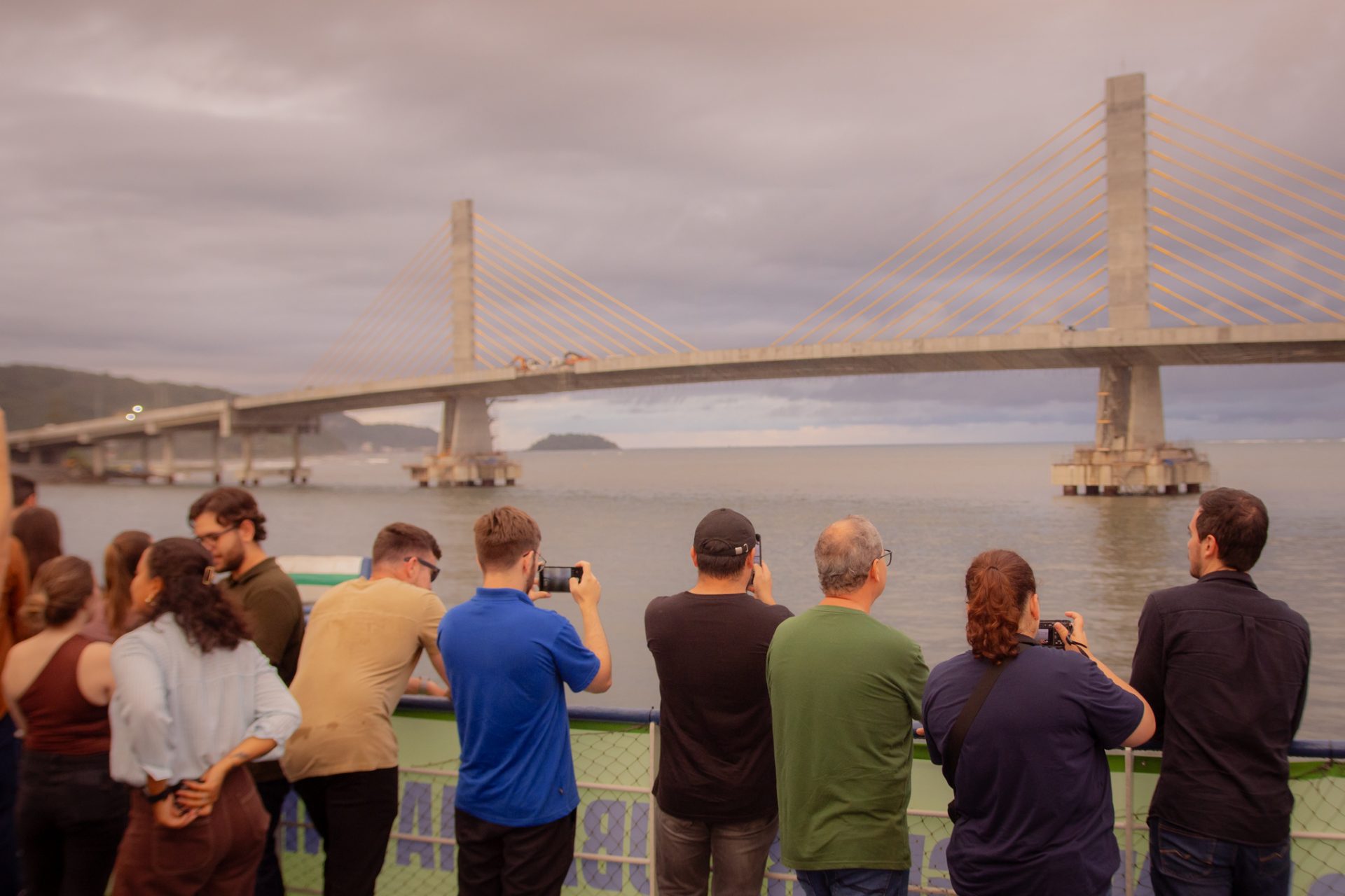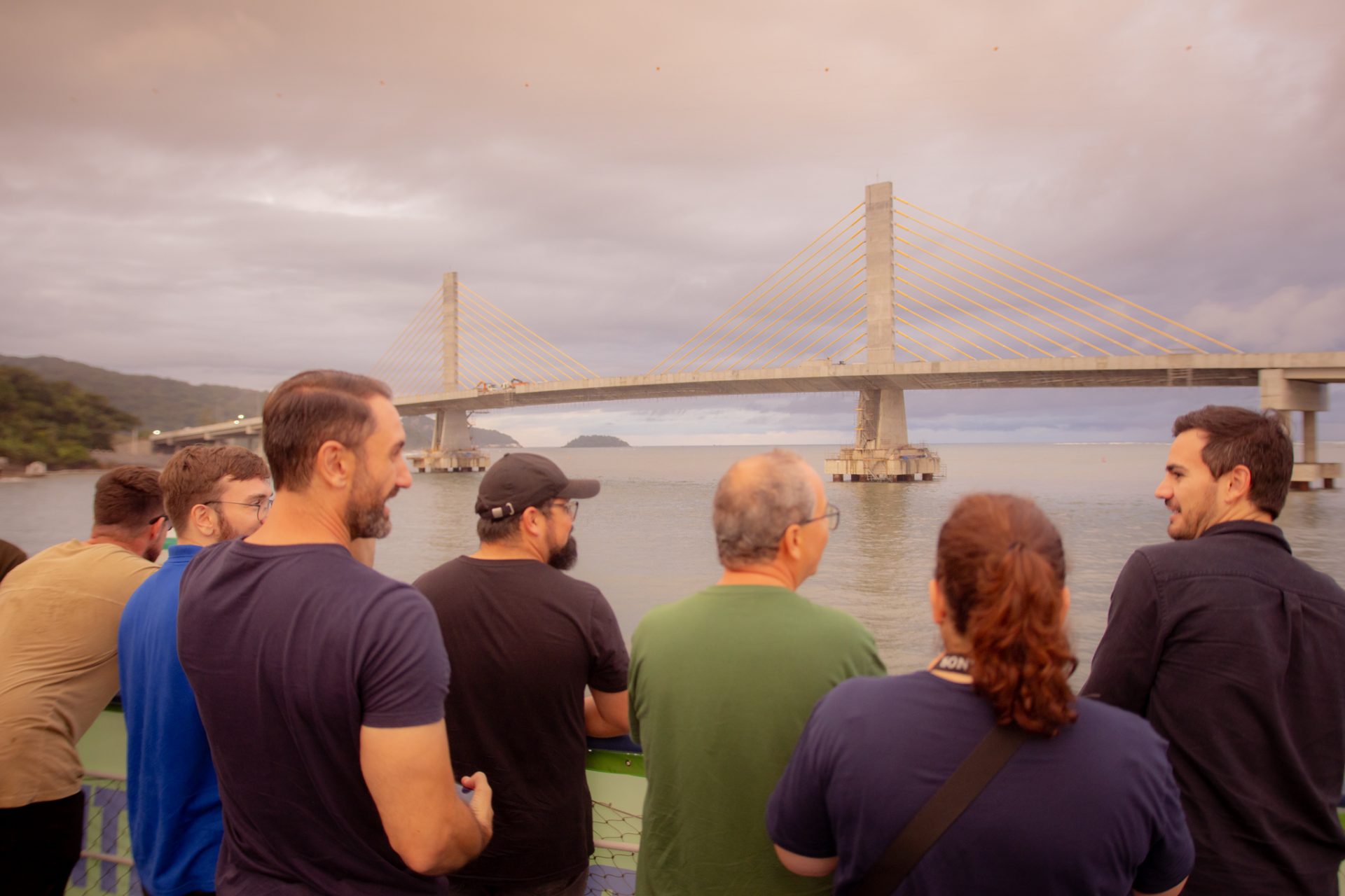 A visita iniciou com uma apresentação de Samuel Colucci, gerente de planejamento, qualidade e engenharia no Consórcio Nova Ponte. Ele detalhou os projetos de arquitetura e de engenharia da ponte e respondeu perguntas das equipes da Proplan e da Precam sobre o regime de contratação integrada, fiscalização e execução da obra. “É muito gratificante falar com pessoas que entendem do que você tá falando, da complexidade e da dificuldade de fazer uma obra dessas, e você pode entrar em detalhes que pessoas que não têm esse conhecimento não conseguiriam absorver para entender as dificuldades e os problemas”, considera Colucci. Em seguida, a comitiva da UEPG pode visitar as barragens do trecho de acesso do lado de Guaratuba e a parte estaiada da ponte, que está em processo de pavimentação.