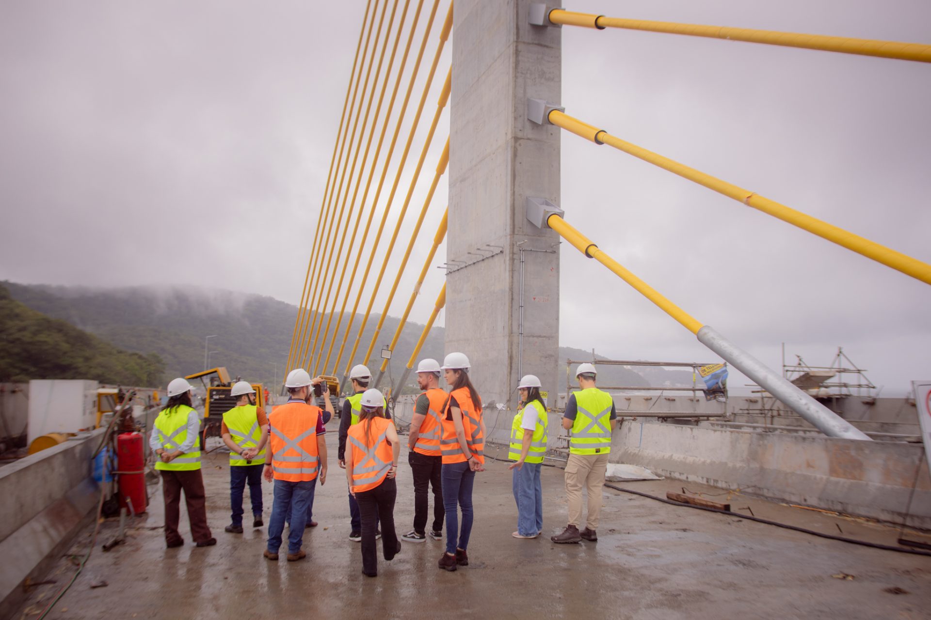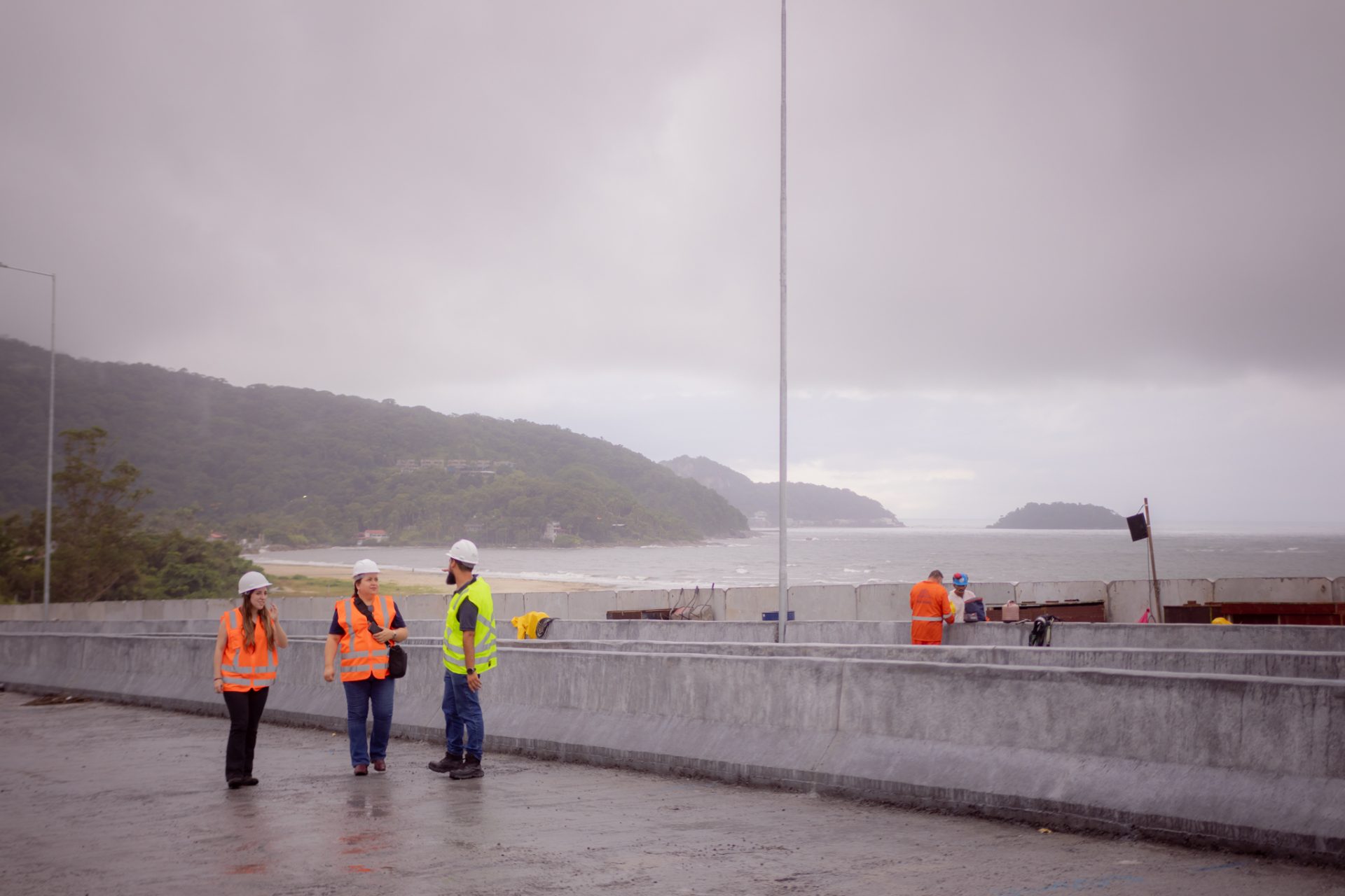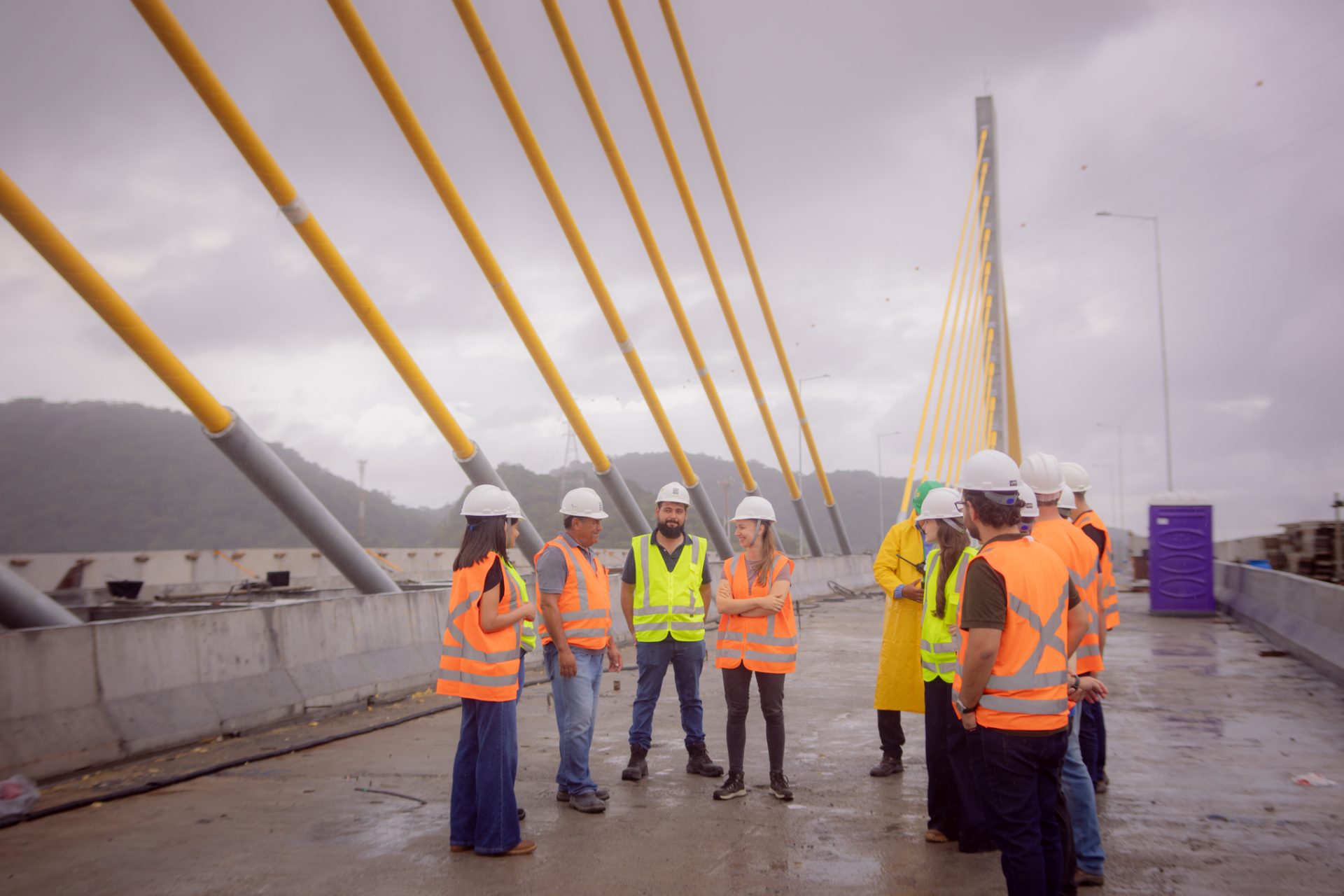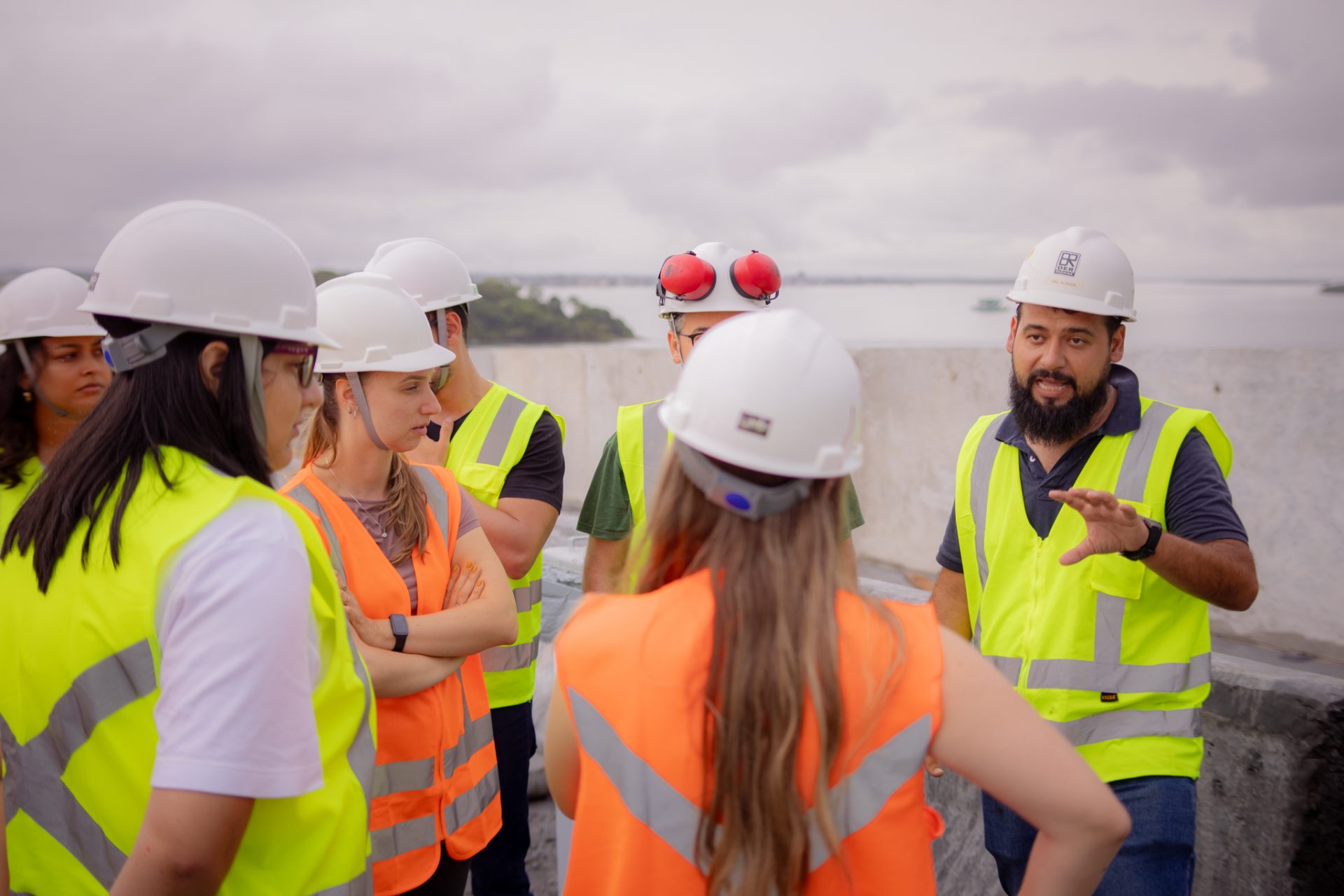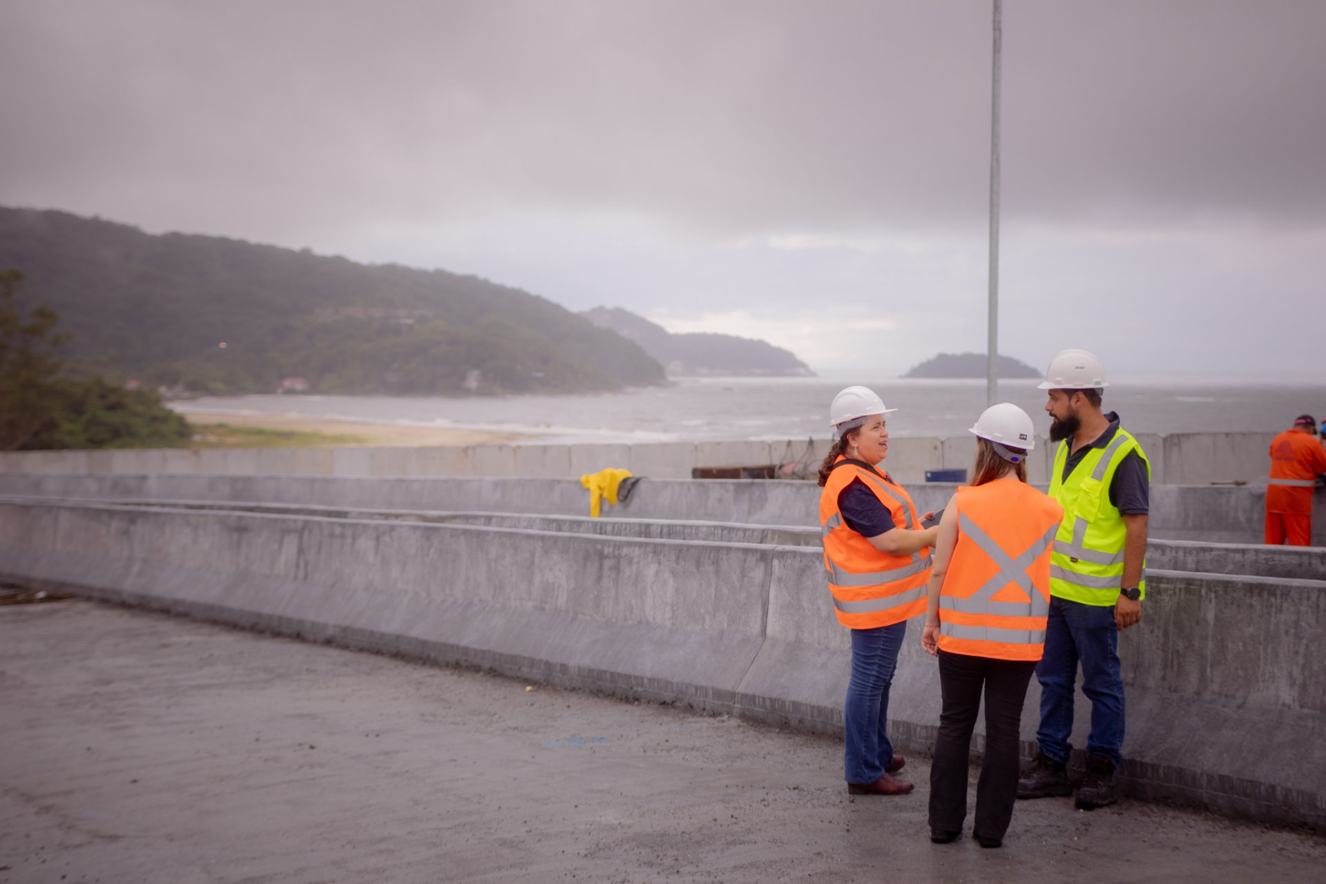 A visita iniciou com uma apresentação de Samuel Colucci, gerente de planejamento, qualidade e engenharia no Consórcio Nova Ponte. Ele detalhou os projetos de arquitetura e de engenharia da ponte e respondeu perguntas das equipes da Proplan e da Precam sobre o regime de contratação integrada, fiscalização e execução da obra. “É muito gratificante falar com pessoas que entendem do que você tá falando, da complexidade e da dificuldade de fazer uma obra dessas, e você pode entrar em detalhes que pessoas que não têm esse conhecimento não conseguiriam absorver para entender as dificuldades e os problemas”, considera Colucci. Em seguida, a comitiva da UEPG pode visitar as barragens do trecho de acesso do lado de Guaratuba e a parte estaiada da ponte, que está em processo de pavimentação.
