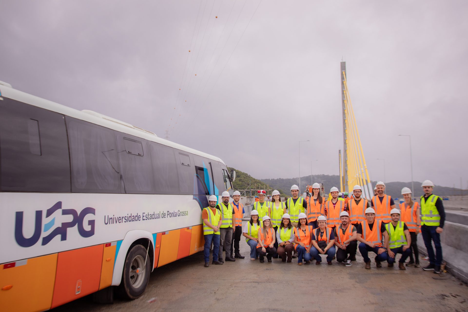 Equipes da Pró-reitoria de Planejamento (Proplan) e da Prefeitura do Campus (Precam) da Universidade Estadual de Ponta Grossa (UEPG) realizaram uma visita técnica ao canteiro de obras da Ponte de Guaratuba na segunda-feira (06). A comitiva de engenheiros, composta por professores, agentes técnicos, residentes e acadêmico, conheceu as estruturas do novo acesso ao litoral paranaense e conversou com profissionais do Consórcio Nova Ponte e do Departamento de Estradas de Rodagem (DER), responsáveis pela execução e fiscalização da obra, respectivamente.