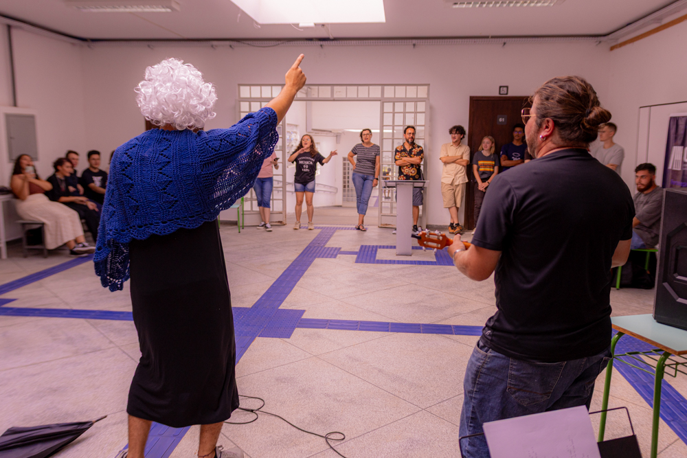 “A gente chega meio tímido, porque cada um tem um estilo e existe o receio de que os outros não gostem. Então eu quis trazer um personagem fora do padrão, algo caricato, para mostrar que aqui ninguém precisa ter vergonha. A ideia era justamente se divertir e deixar o pessoal mais à vontade”, conta. Geraldo explica que a proposta foi criar uma abertura leve e bem-humorada, inspirada na personagem Velha Surda do programa A Praça É Nossa e na banda Geriatricus. “Eu sempre fico pensando em como agradar todos os estilos e trazer músicas que todo mundo conheça. Aos poucos, a vergonha vai indo embora, os estilos aparecem, todo mundo acaba se soltando e é coberto de aplausos. Isso é muito bonito de ver”.