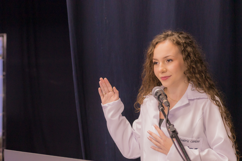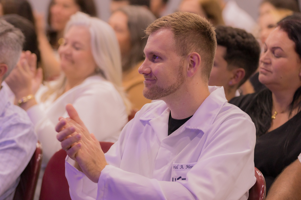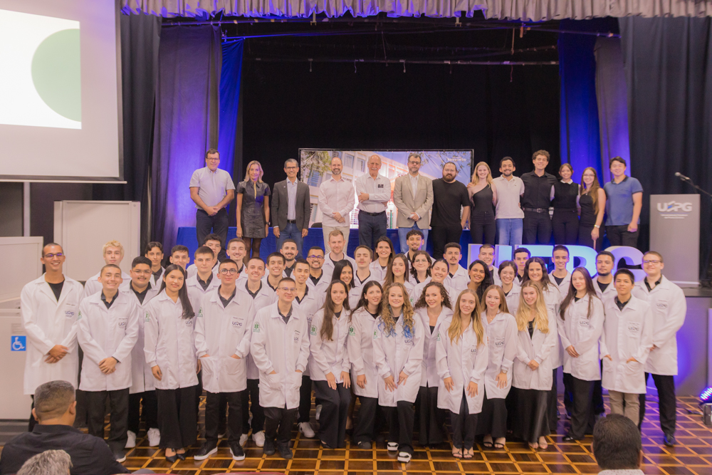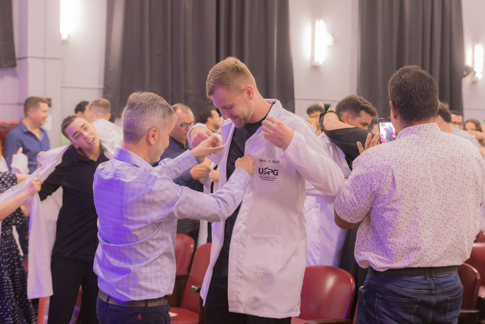 Na noite de sexta, foi a vez do curso de Medicina realizar a tradicional Cerimônia do Jaleco, no qual os calouros recebem, pela primeira vez, a roupa fundamental durante os seis anos de curso para atuação nos laboratórios e nos hospitais universitários e demais espaços de saúde de Ponta Grossa. O evento contou com a participação do vice-reitor da UEPG, professor Ivo Demiatte, diretor adjunto do Sebisa, professor Gonçalo Cassins Moreira do Carmo; e dos professores de Medicina: Fabiana Postiglioni Mansani, Gilberto Baroni, Ricardo Zanetti Gomes, Mario Montemor e do professor aposentado Cesar Roberto Busato. Um dos alunos que recebeu o seu jaleco durante a cerimônia foi Oséias Vladimir Gonçalves Cordeiro, filho do servidor da Pró-Reitoria de Assuntos Administrativos (Proad) José Vladimir Gonçalves Cordeiro.
