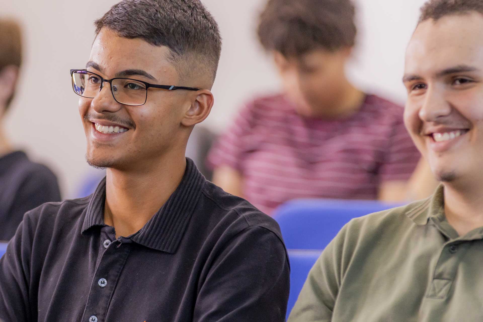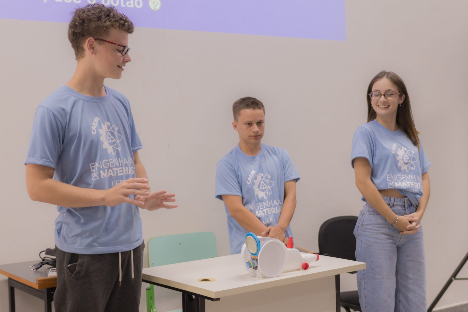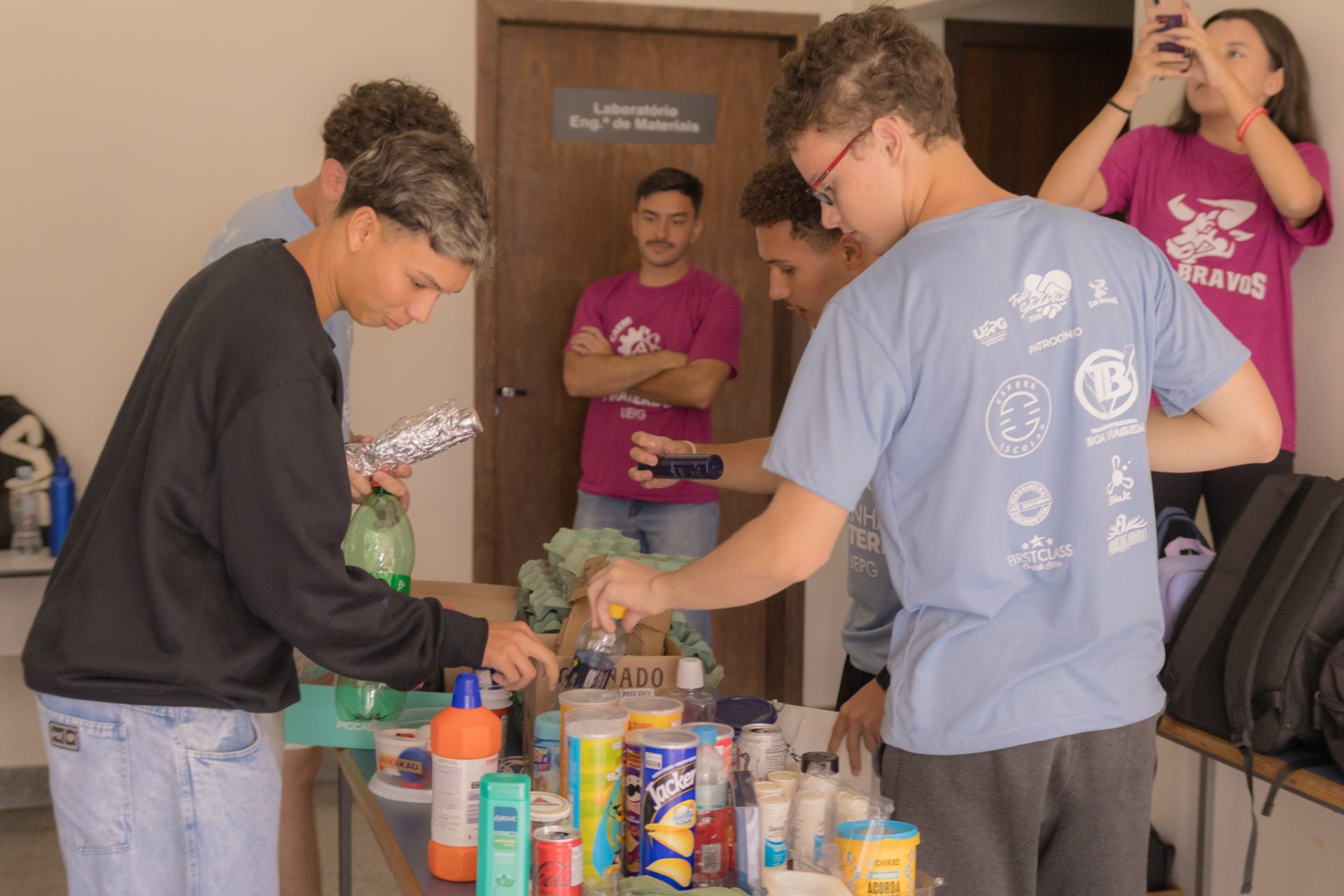 A tradicional Dinâmica dos Recicláveis, promovida pelo Centro Acadêmico de Engenharia de Materiais (Caem), foi uma das atividades de acolhida dos novos alunos. “O intuito é a integração, não só calouro fazer amizade com calouro, mas com veteranos de todos os anos, promover contato entre eles e o espírito de equipe”, explica o diretor cultural do Caem, Pedro Schnitzler. Durante a atividade, os novos alunos se dividiram em equipes, tiveram um minuto para separar itens recicláveis e depois foram desafiados a pensar numa finalidade para aquilo e elaborar um produto funcional. “É para testar a criatividade deles, incentivar a resolver um problema de forma rápida com o que tem à disposição”, complementa a diretora de marketing Elisa Matoso.